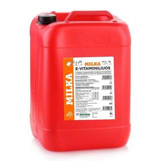 Milka E-vitamiiniliuoksen voi annostella suoraan rehuun tai veteen.